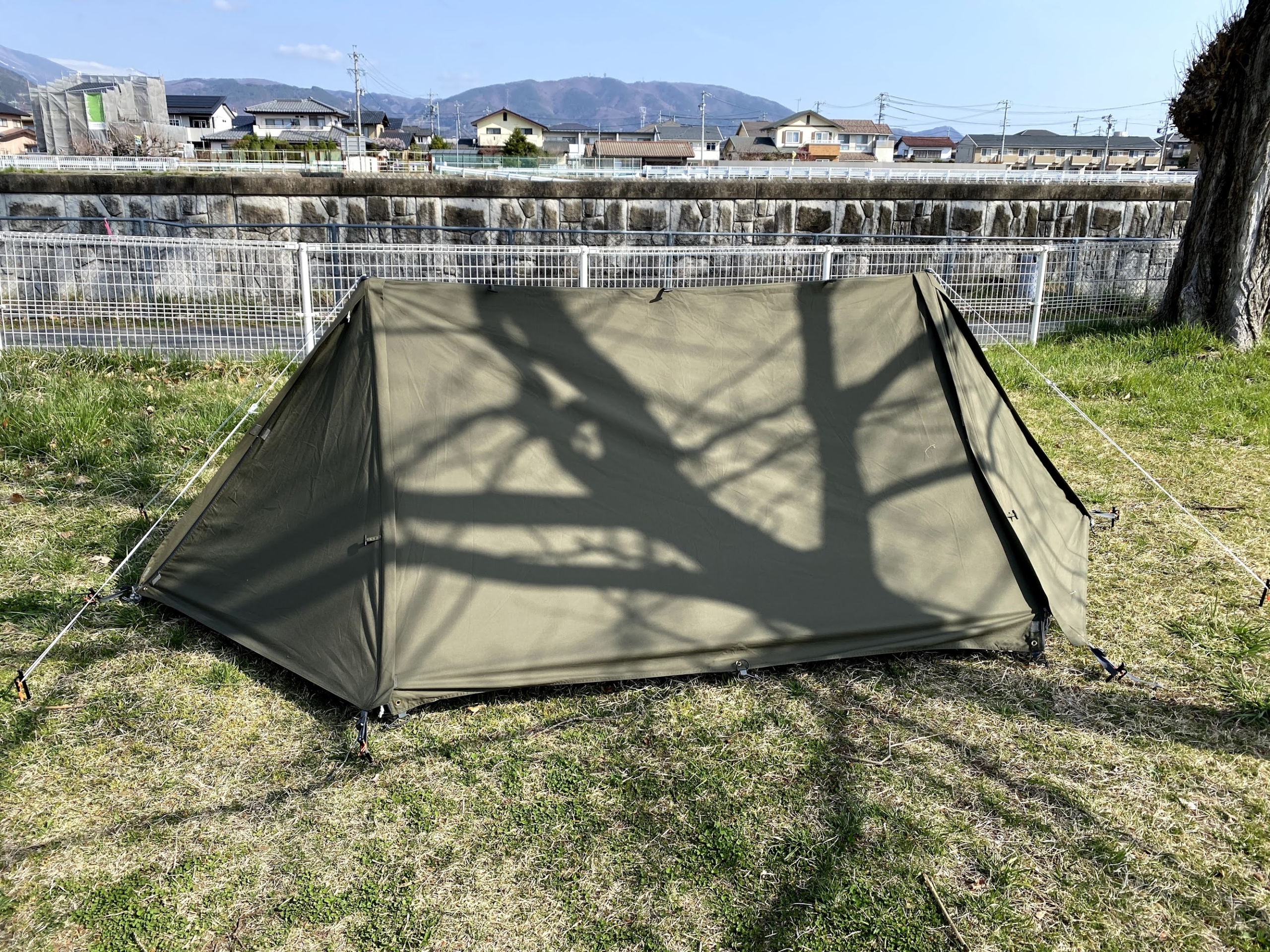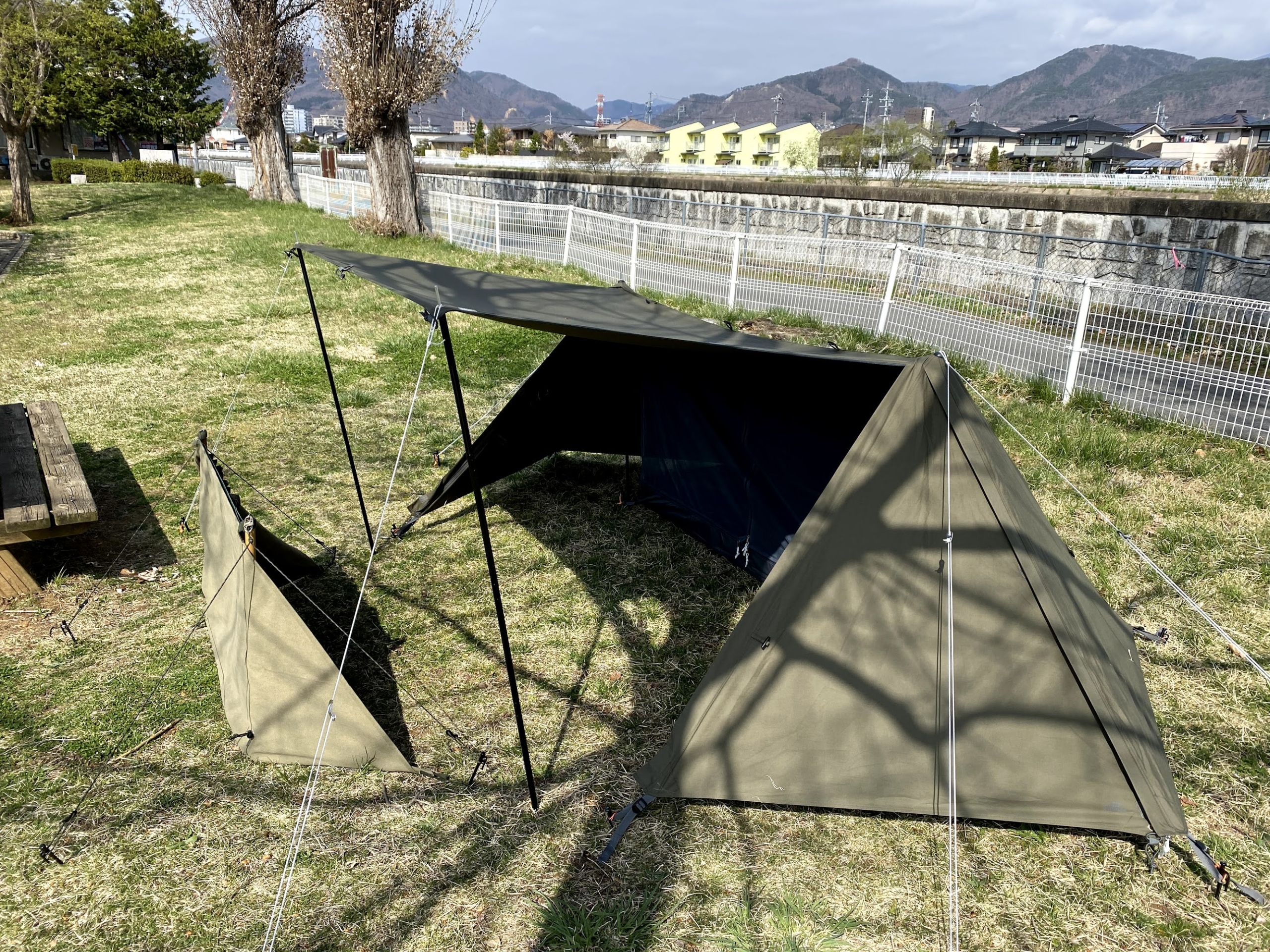 ソトアソビ Soto Asobi>キャンプ 軍幕と陣幕2021-04-02 ソロキャンプ用のパップテント 公園で試し張りした ずっと憧れていたもの 【送料無料】BUNDOK ソロベース TC/BDK-79/テント、パップ型、パップテント、ソロテント、ソロキャンプ、ミリタリー、ハーフシェルター価格:22800円(税込、送料別) (2021/4/2時点) 楽天で購入 立て方はYouTubeで確認したので問題ないんだけど ただちょっとシワがあるよな・・ 跳ね上げスタイルで手前に陣幕を張る 陣幕は手作りのもの 中で座ってみるとプライベート空間が確保されて なかなかくつろげる 早くキャンプに行ってみたい キャンプPosted by dz-inc